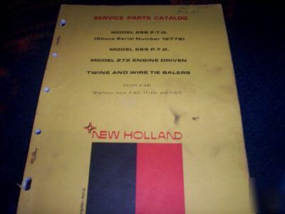 This is the Sperry New Holland Service Parts Catalog for Model 268 P.T.O. (above Serial No. 12778); Model 269 P.T.O., Model 272 Engine Driven Twine and Wire Tie Balers. Issue 6-68 (replaces 2-65; 11-65; and 1-67). #5026831. 68 pages. Catalog in great condition for it's age, some fingerprint smudges throughout, handwriting on front cover but all very readable and usable.