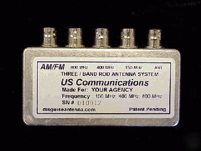 EscrowUnlt © AP6.0Brand New, Made to order with your center frequency. Includes a broadcast coupler to use with your standard am/fm radio. Antenna replaces factory cowl mounted antenna with disguised components that mimic the look and functionality of the factory parts. The broadcast coupler is included and allows the dual use of the antenna for both the two-way radio and your standard broadcast receiver without the degradation on your AM reception as other designs introduce. 150 watt maximum power. Available on the VHF UHF 700 800 and 900 Mhz bands.