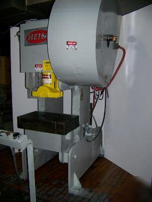 1 - (used) HEIM Model 55 single crank flywheel press with air clutch. Shut height - 12", Slide adjustment - 4", Stroke - 5", Strokes per minute - 120, Main motor - 5 HP 220-440/3/60 AC, Throat depth, center of slide to side - 10", Face of ram - 10" x 15", Hole in ram - 2", Bed L-R x F-B - 18" x 28", Rectangular opening in bed - 9" x 16", Width of opening in back - 18". Machine equiped with dual palm buttons. Machine serial number 2796, new approximately 1976. Price includes loading on your flat bed truck. For any questions or additional photos, call or email Jon Hebert. (***)-825-1511 ****@bellsouth.net