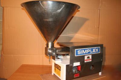 We are selling a used Simplex Volumetric Filler for Viscous Products Model A.S. This single head table-top machine is compact and durable and recognized as a world standard for liquid, semi-solid and/or soft particulate filling; for example creams, jams, jelly, salsas, these are a few products this machine can fill. The Simplex table model AS-1 is a simple and accurate filling machine which can merge with an automated conveyor system with the addition of a Simplex floor stand and automation kit. Any manual AS-1 can be upgraded to be fully automatic. Quickly and easily cleaned, the AS-1 is also very reliable. Some AS-1s have been in continuous operation for over 40 years. Economical and versatile, all contact points are constructed of USDA approved materials, making it useful for many products and operations.