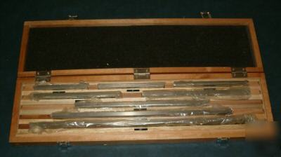 This very lightly used set of long gage blocks is for use in calibration of large calipers and micrometers. The set includes 8 pieces, of length 5, 6, 7, 8, 10, 12, 16, and 20 inches. The blocks are stored in the original wooden case. Included is an NIST-traceable calibration certificate from 2001. Current list price for this item at J&L Industrial is $1301.89 This is Fowler part number 53-670-008