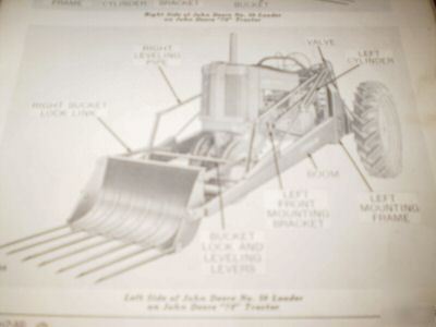 I have a Parts Catalog for John Deere No 50 Hydraulic Loader, for "A", "B", "G", "50", "60", and "70" Tractors. The manual has the following Contents: Boom, Mounting Frame-LH-RH, Leveling Pipes, Bucket Lock and Leveling Levers, Cylinder RH-LH, Valve and Hoses, Bucket and Extension Sheet, Snow Bucket-60 and 80 Inch, Dirt Bucket, Bulldozer, Exhaust Deflector, and Stabilizer for Bulldozer. The manual is 25 pages, from 1955, and in ok condition.